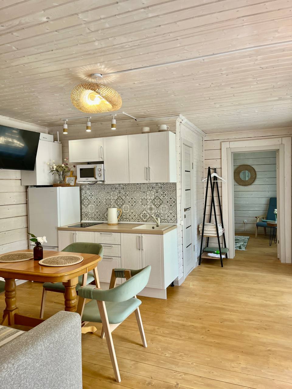 две спальни с большой кроватью, кухня с обеденной зоной и раскладным диваном, санузел с горячей водой и душем, открытая терраса с мебелью.